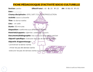 C’est un ensemble d’activités d’éveil et de loisirs qui inculquent à l’enfant des valeurs et des pratiques socioculturelles. Ces activités sont très diverses et permettent d’ouvrir l’enfant à son environnement culturel dans ses différentes dimensions. Ainsi l’enfant va pouvoir découvrir des danses, des chants, des métiers, des éléments de géographie ou même apprendre à connaitre la nature qui l’entoure.