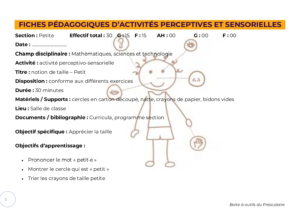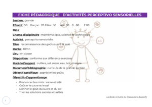 C’est une activité qui permet de développer la curiosité chez l’enfant, de stimuler son attention, son sens de l’observation et sa mémoire. Elle affine les perceptions et permet de les traduire dans un langage correct, parvenant ainsi à une meilleure connaissance du monde extérieur. L’activité perceptivo-sensorielle est une activité d’éducation de la vue, de l’ouïe, du toucher, du goût et de l’odorat.