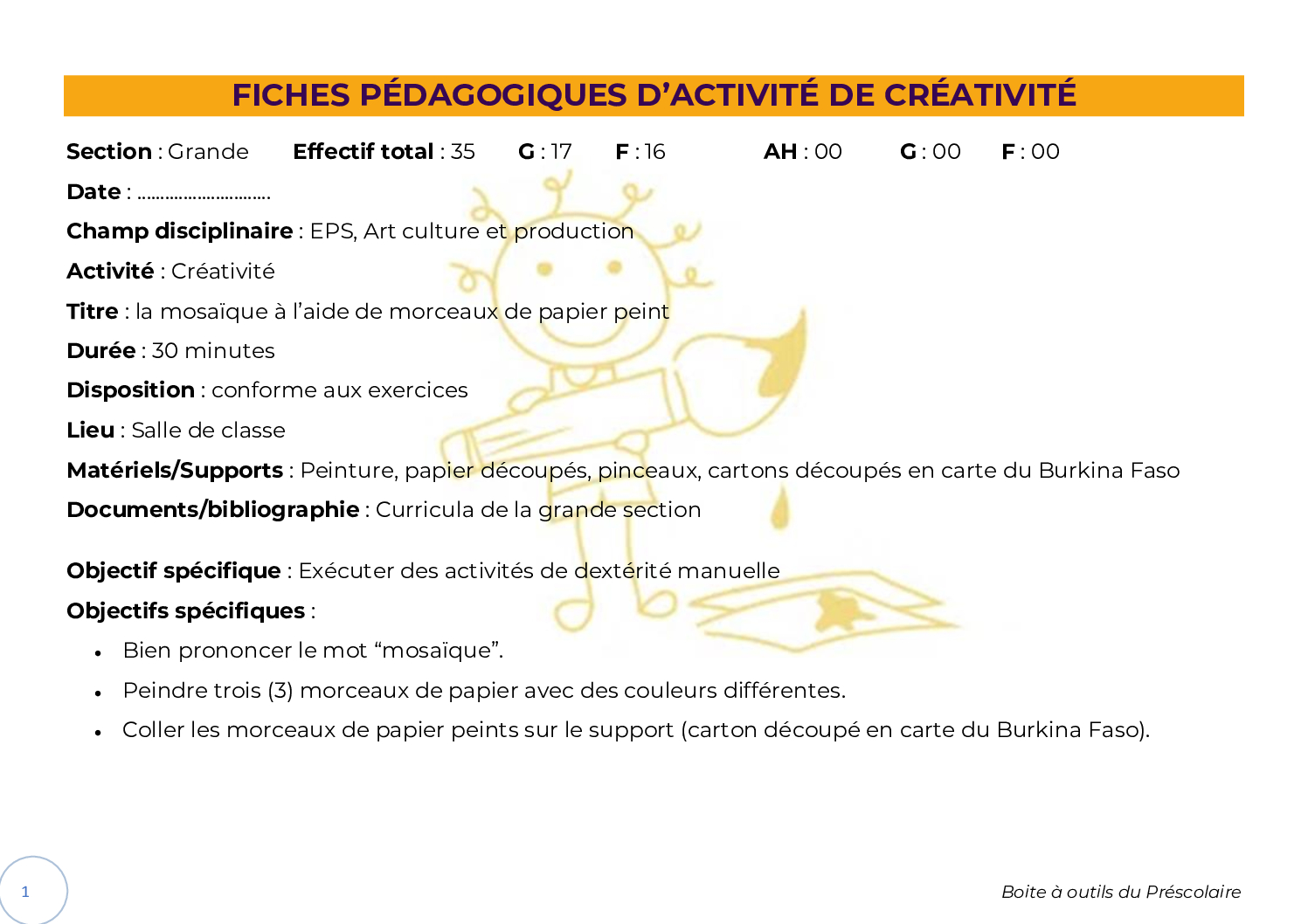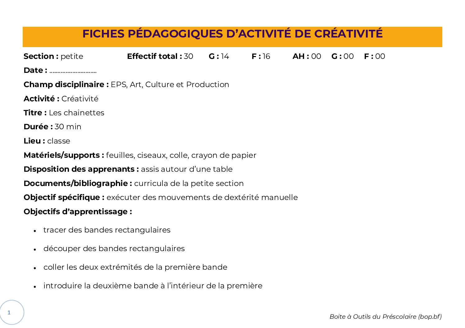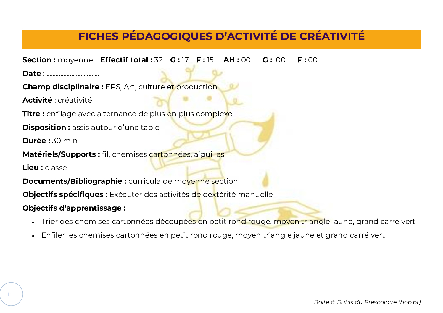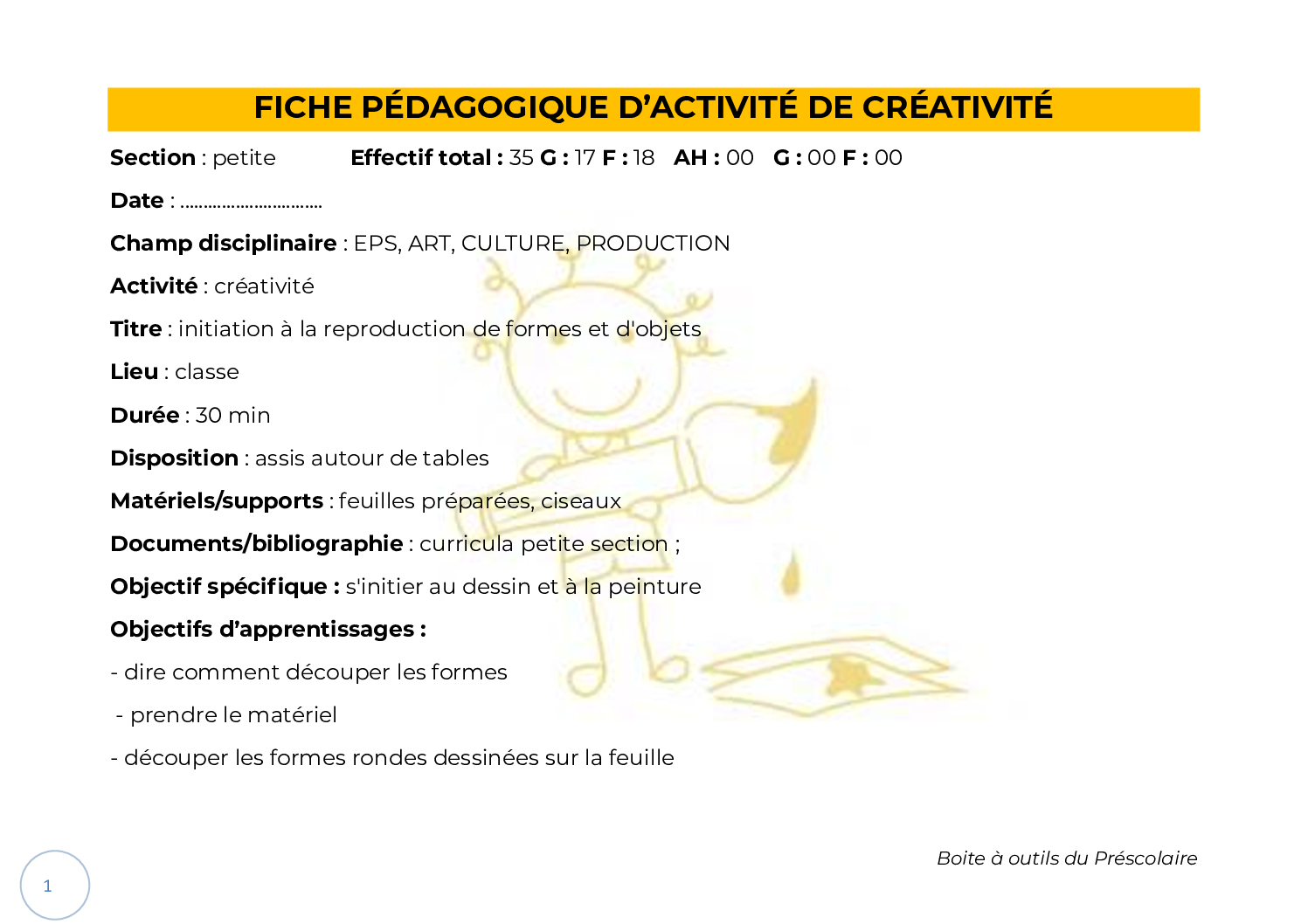 C’est une activité d’expression manuelle qui développe chez l’enfant l’imagination, l’esprit d’esthétique, la dextérité, le goût et l’esprit de créativité à travers la manipulation et la transformation de matériaux mis à sa disposition.